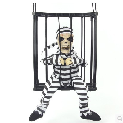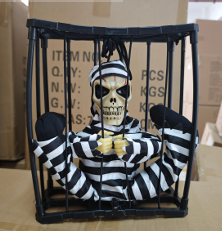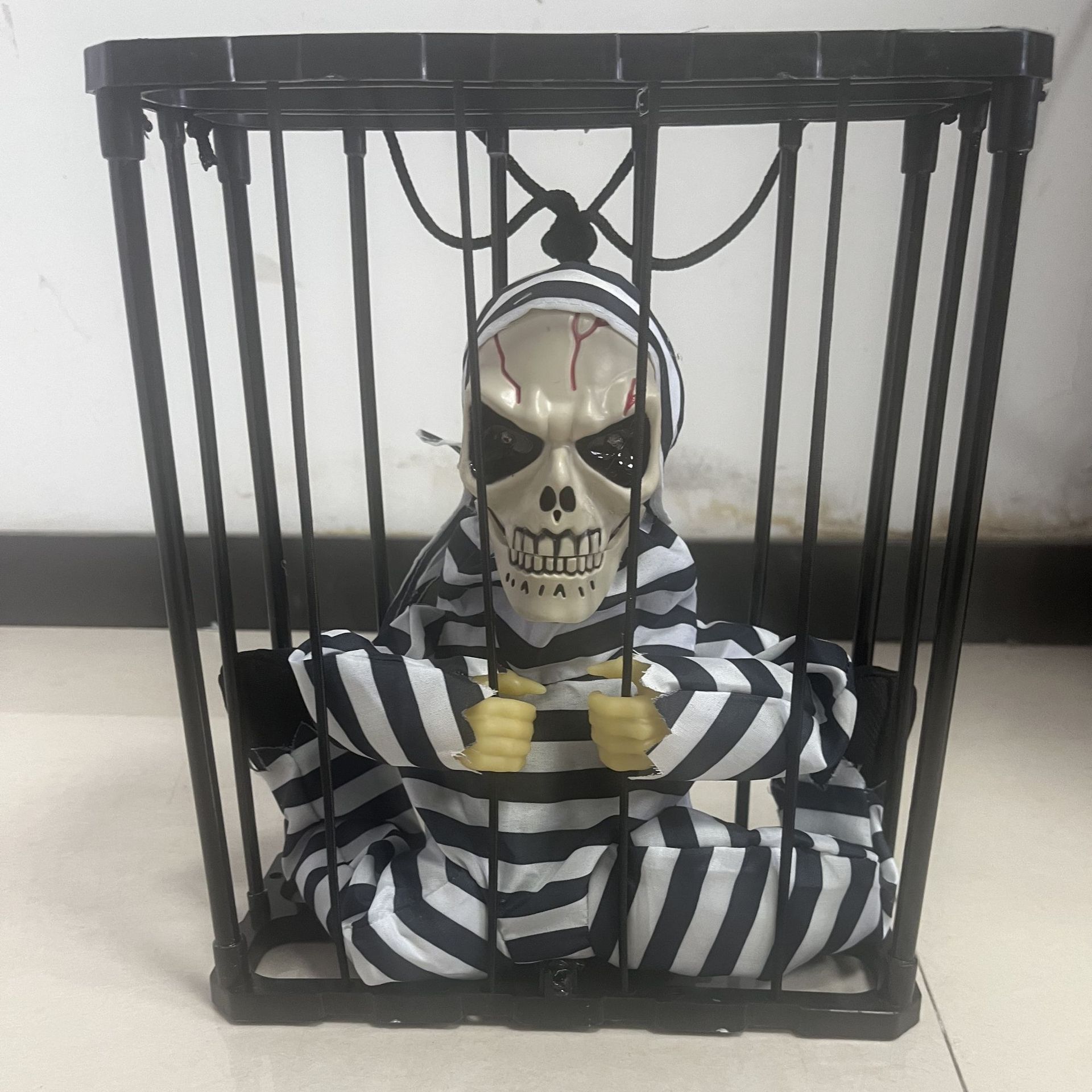 Esta decoración de Halloween aterradora representa a un prisionero con ojos rojos que, al activarse por movimiento o luz, saca la cabeza de su jaula y grita “¡Déjame salir!”, causando un gran susto a quienes pasen cerca.
